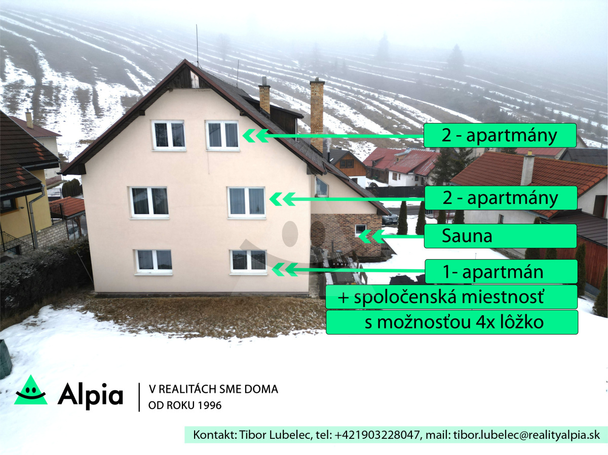 We offer for sale an exceptional apartment house located in the charming village of Liptovská Teplička. This is an ideal investment for those seeking passive income or a private mountain retreat near ski resorts and the High Tatras.