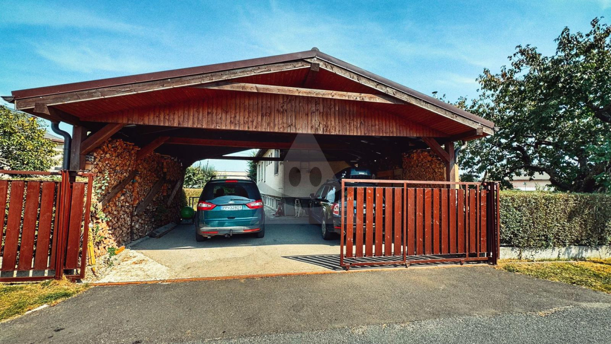 Druhý vstup na pozemok ponúka ďalšie dve zastrešené parkovacie miesta a sklad dreva.