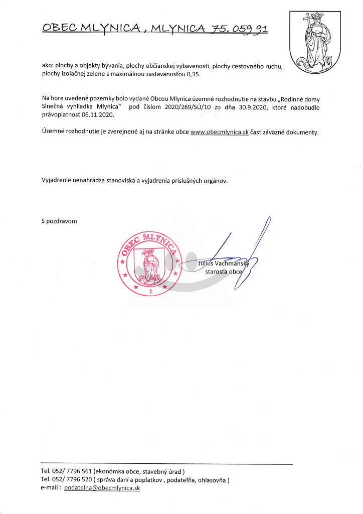 Pozemky sú rovinaté a nachádzajú sa v intraviláne obce, čo zaručuje budúcim majiteľom maximálny komfort. Najväčším benefitom je panoramatický výhľad na Vysoké Tatry, ktorý dodáva budúcemu bývaniu neopakovateľnú atmosféru. Na pozemky bolo vydané Obcou Mlynica územné rozhodnutie na stavbu „Rodinné domy Slnečná vyhliadka Mlynica“ pod číslom 2020/269/SÚ/10 zo dňa 30.9.2020, ktoré nadobudlo právoplatnosť 06.11.2020. Môžete stavať už tento rok.